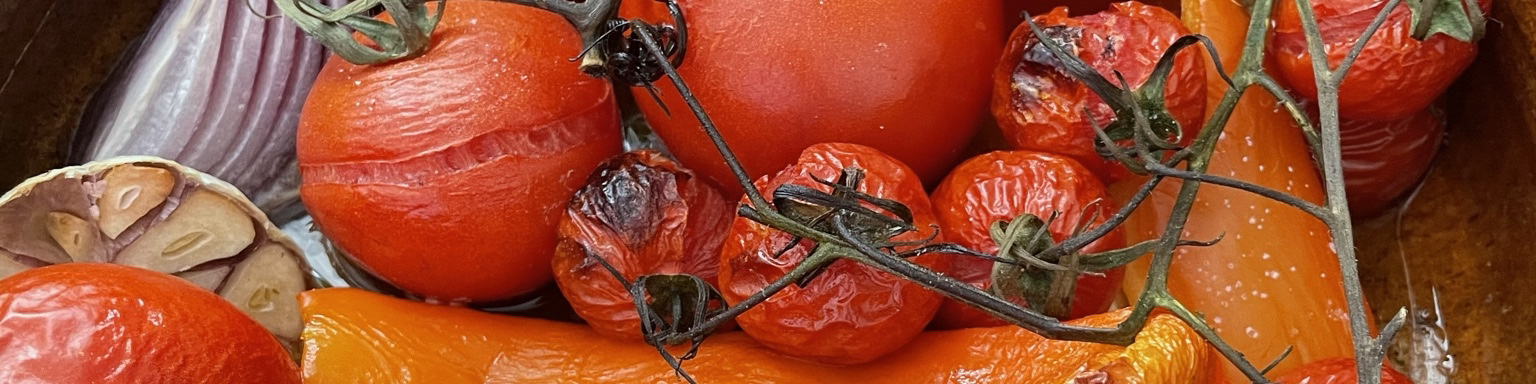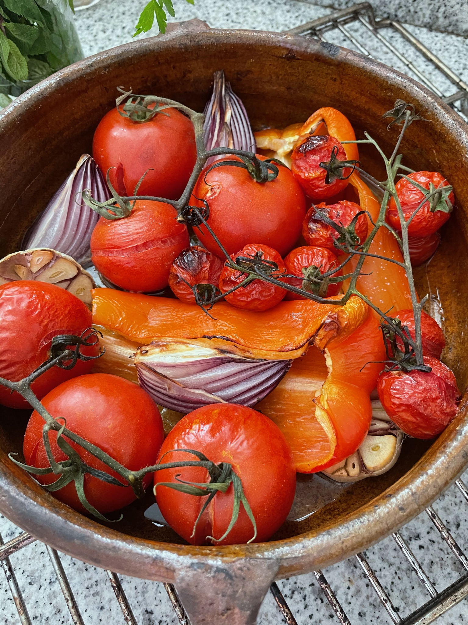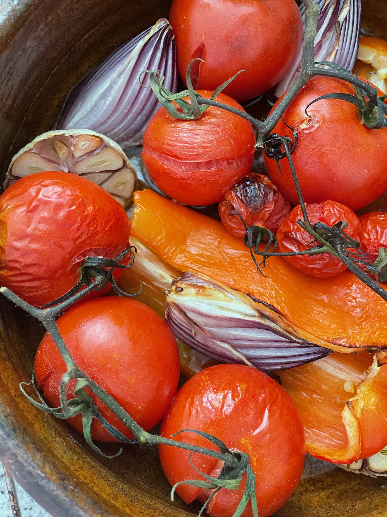 In a heat proof container put the veggies with salt and a generous amount of olive oil in the oven for 45-60 minutes. Ten minutes before removing add some broth to the container.